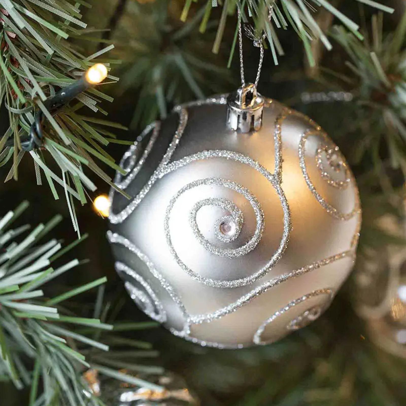 The tree features an exquisite mix of professionally selected Christmas decorations in various sizes, shapes, and finishes for added depth and texture, including glossy, matte, shimmering, and shiny. With gemmed iridescent snowflakes, white bows, and silver glitter poinsettias, this white artificial Christmas tree adds a dream-like ambiance to your interior. Each Christmas bauble is firmly attached to a string to make it easier to hang up. The tree is complete with a beautiful iridescent white star topper.